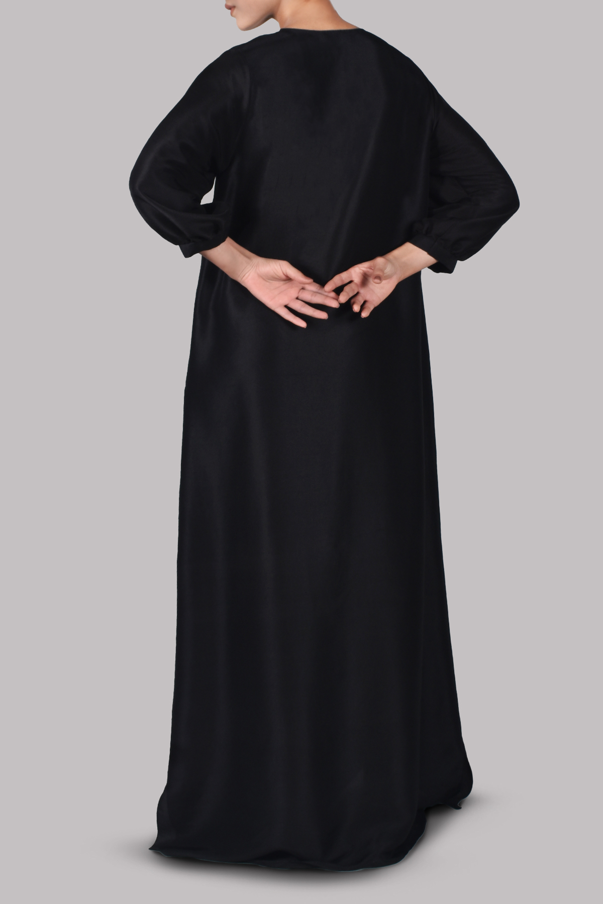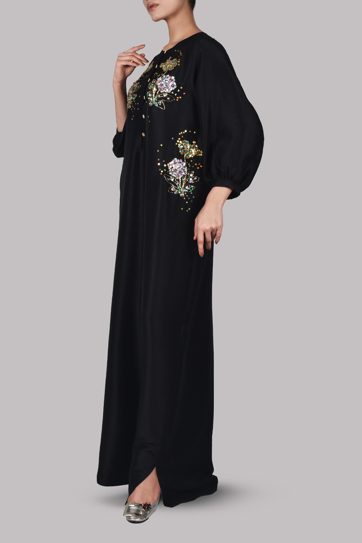 Crafted from luxurious black raw silk, this maxi exudes timeless elegance with its fluid silhouette. The design is elevated with delicate sequin flower bunches, intricately hand-embellished to add dimension and a subtle sparkle with French buttons.