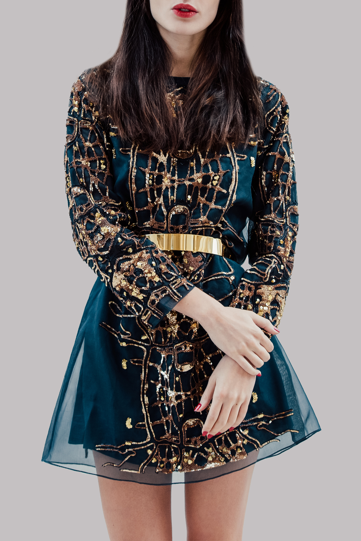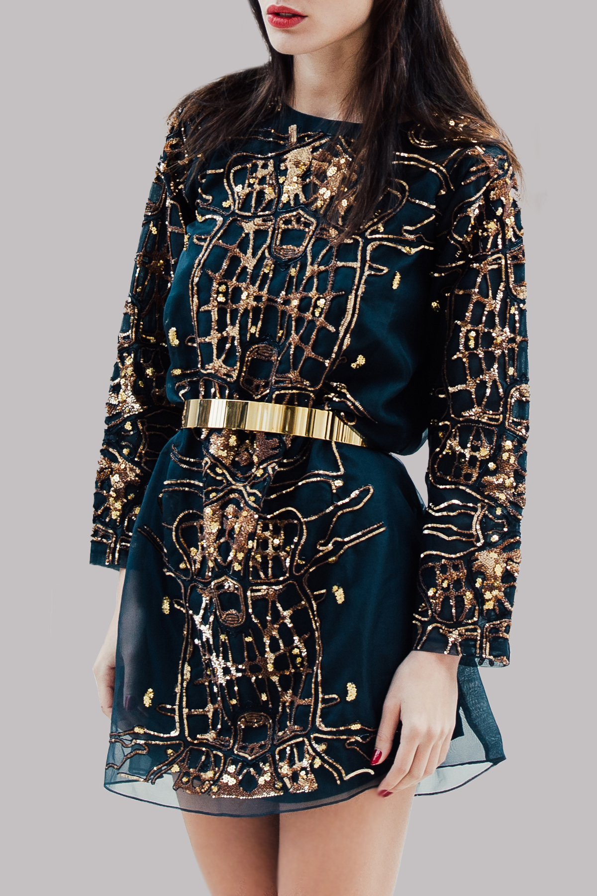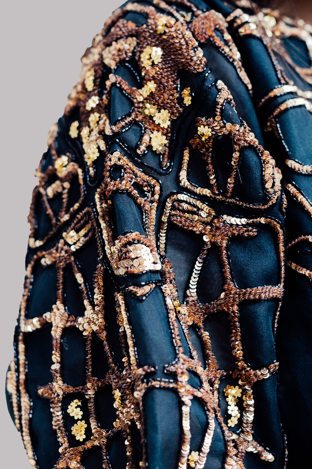 A statement in dark elegance, this Black Iris organza dress is richly adorned with intricate embroidery and shimmering embellishments. Hand-applied French and Italian sequins create a luminous interplay of light against the sheer organza, while delicate embroidery adds depth and artistry to the silhouette.