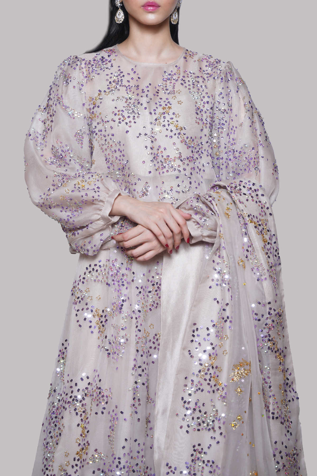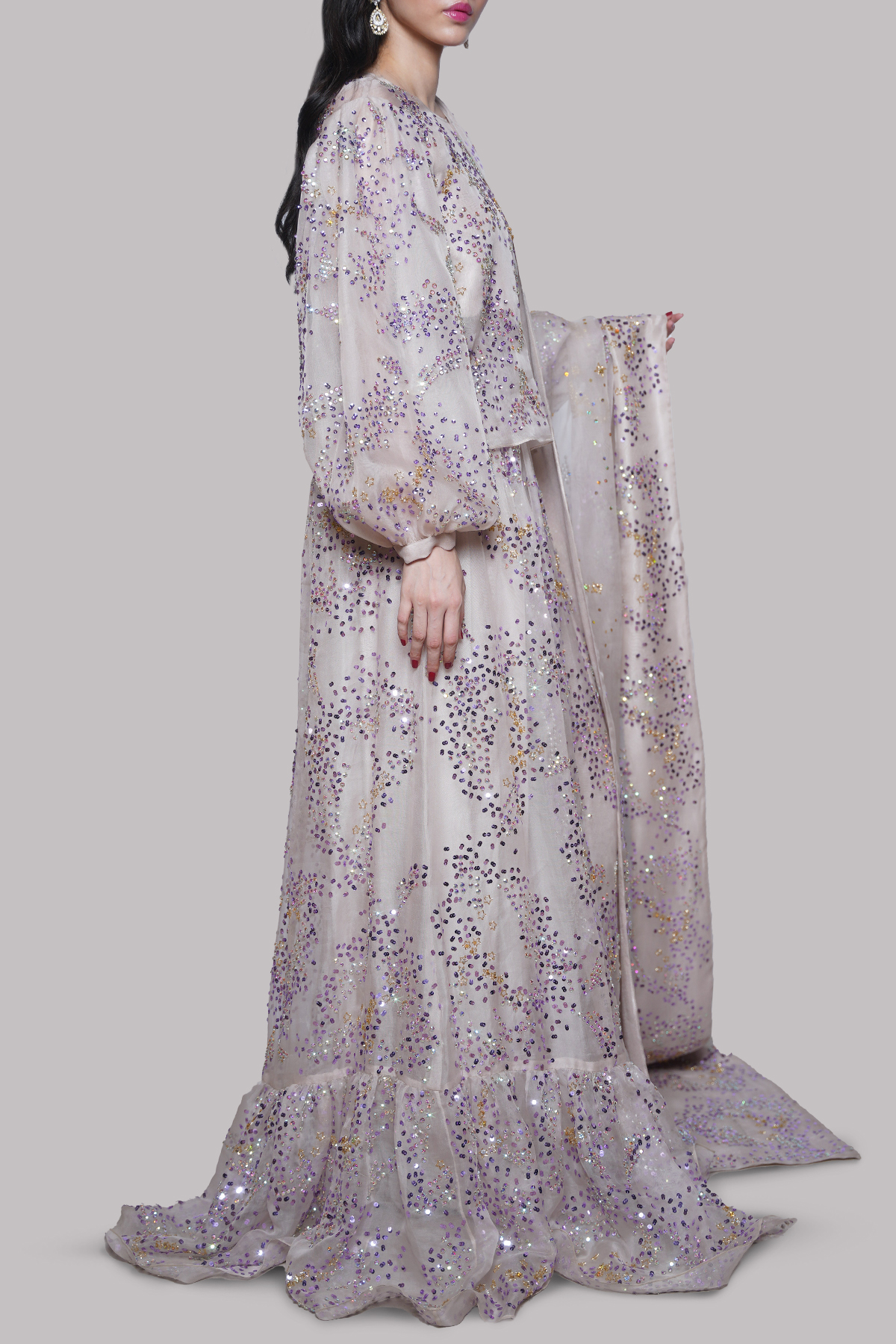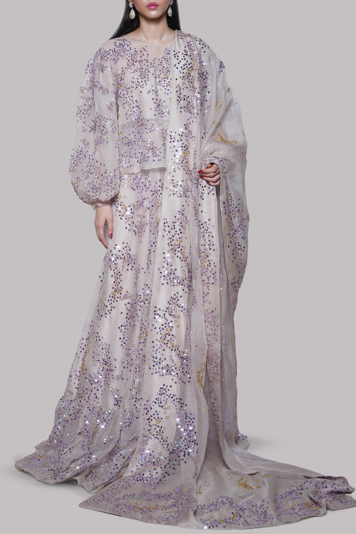 Radiate elegance in this Silver Grey Embellished Organza Ensemble, designed to make a lasting impression. The organza top features delicate embellishments and dramatic bell sleeves, blending sophistication with a touch of flair. It is paired with a tiered embellished skirt, adding graceful volume and movement to the look.